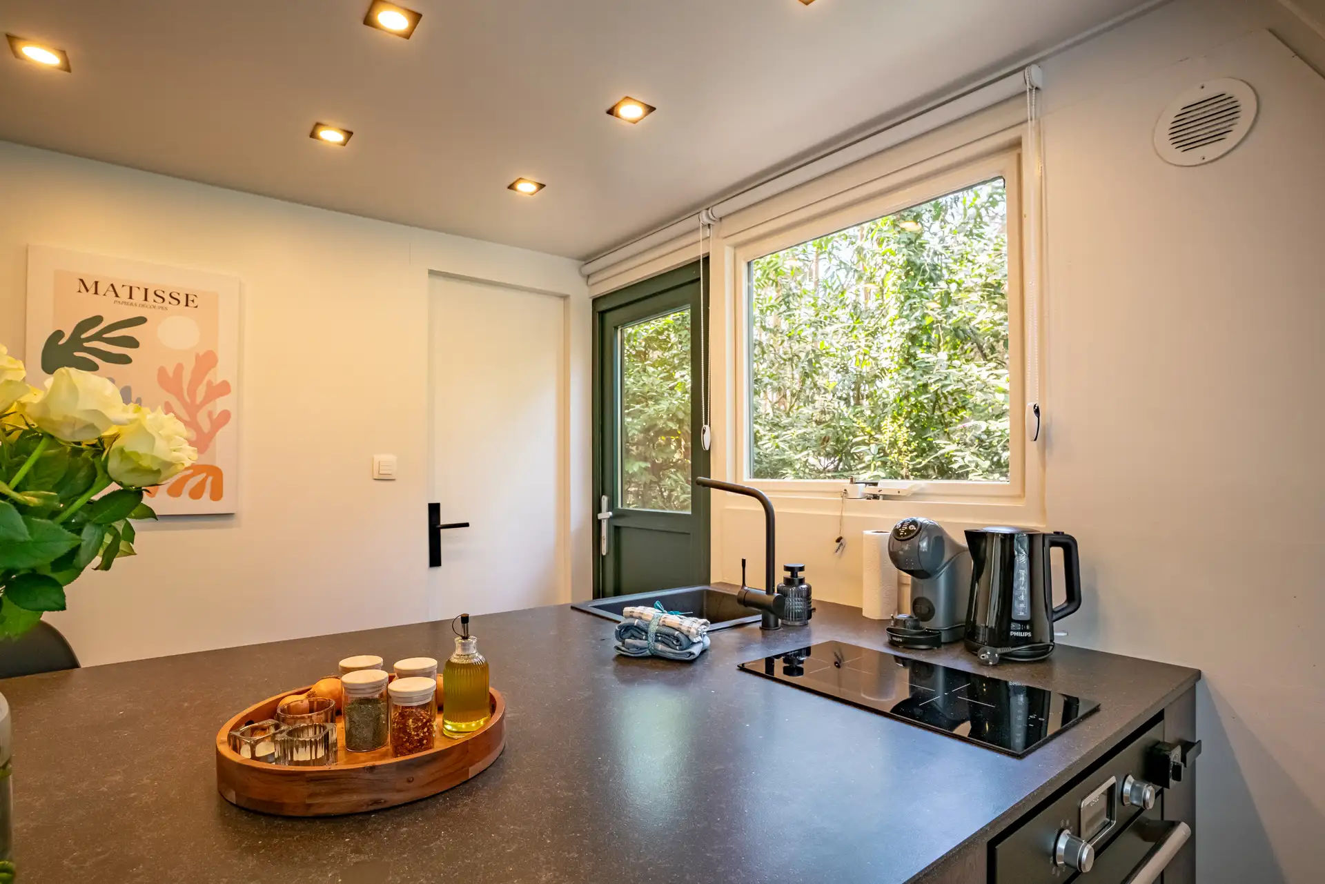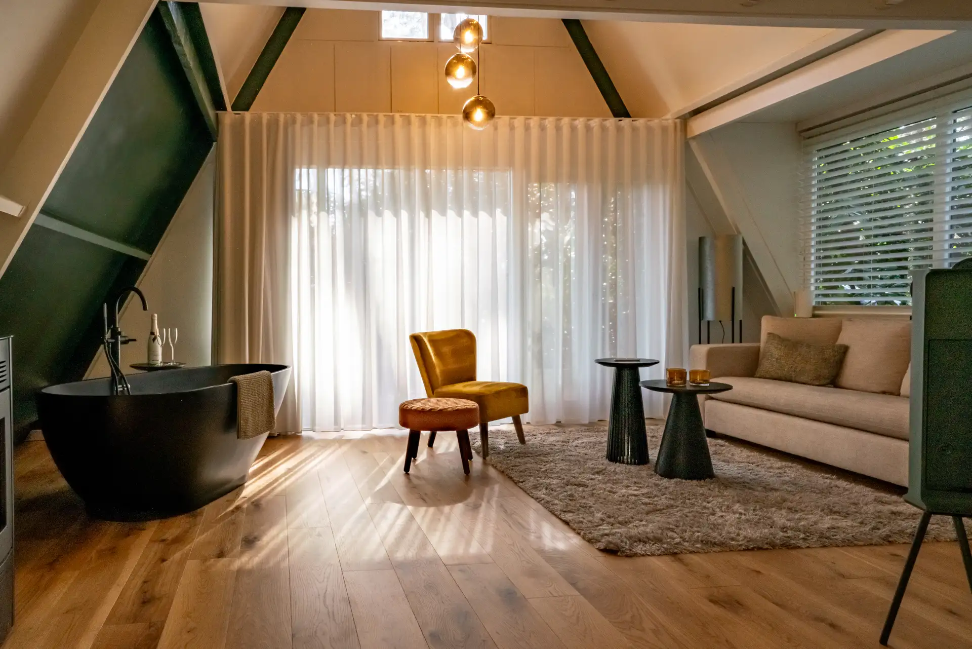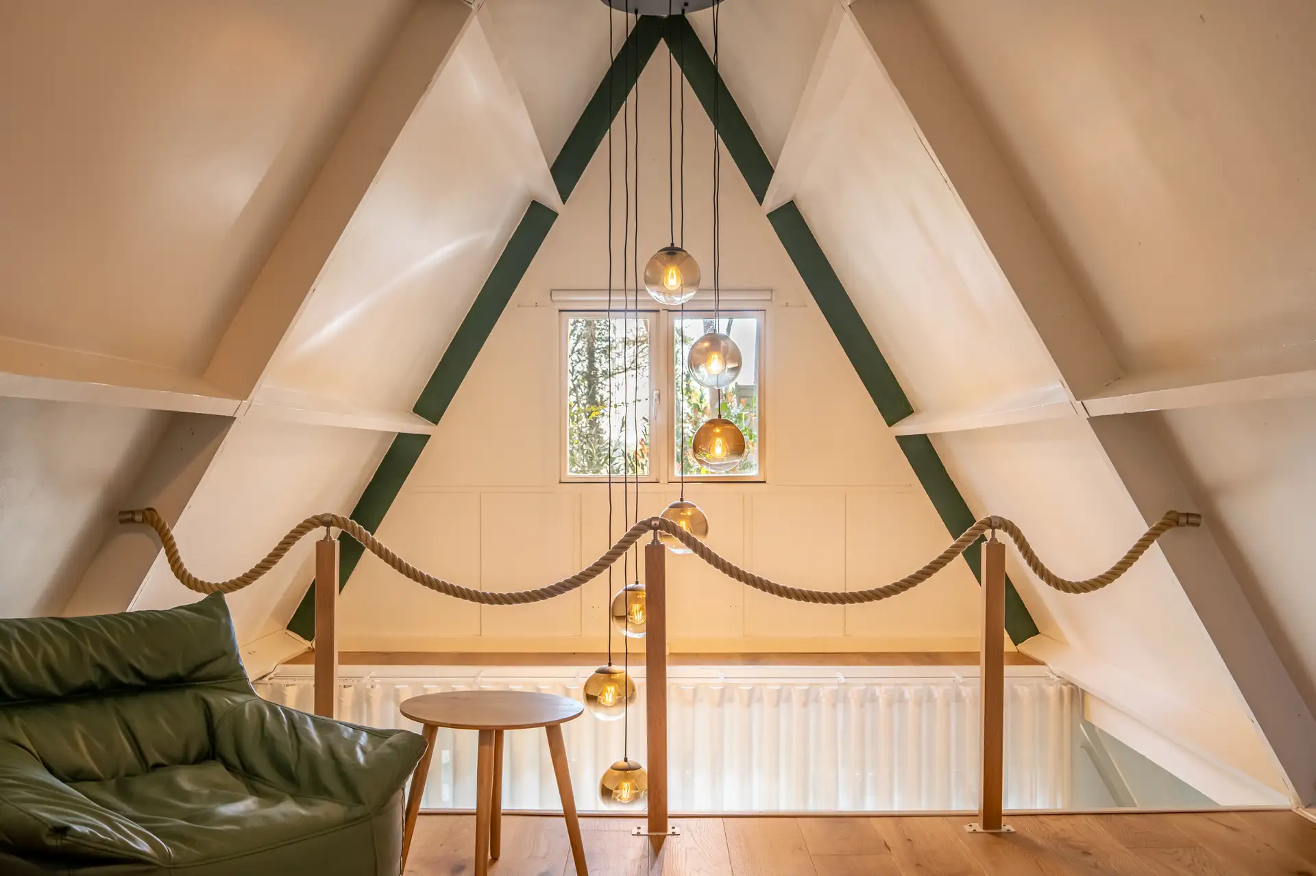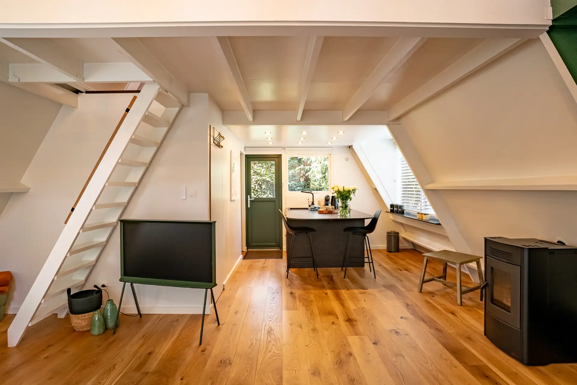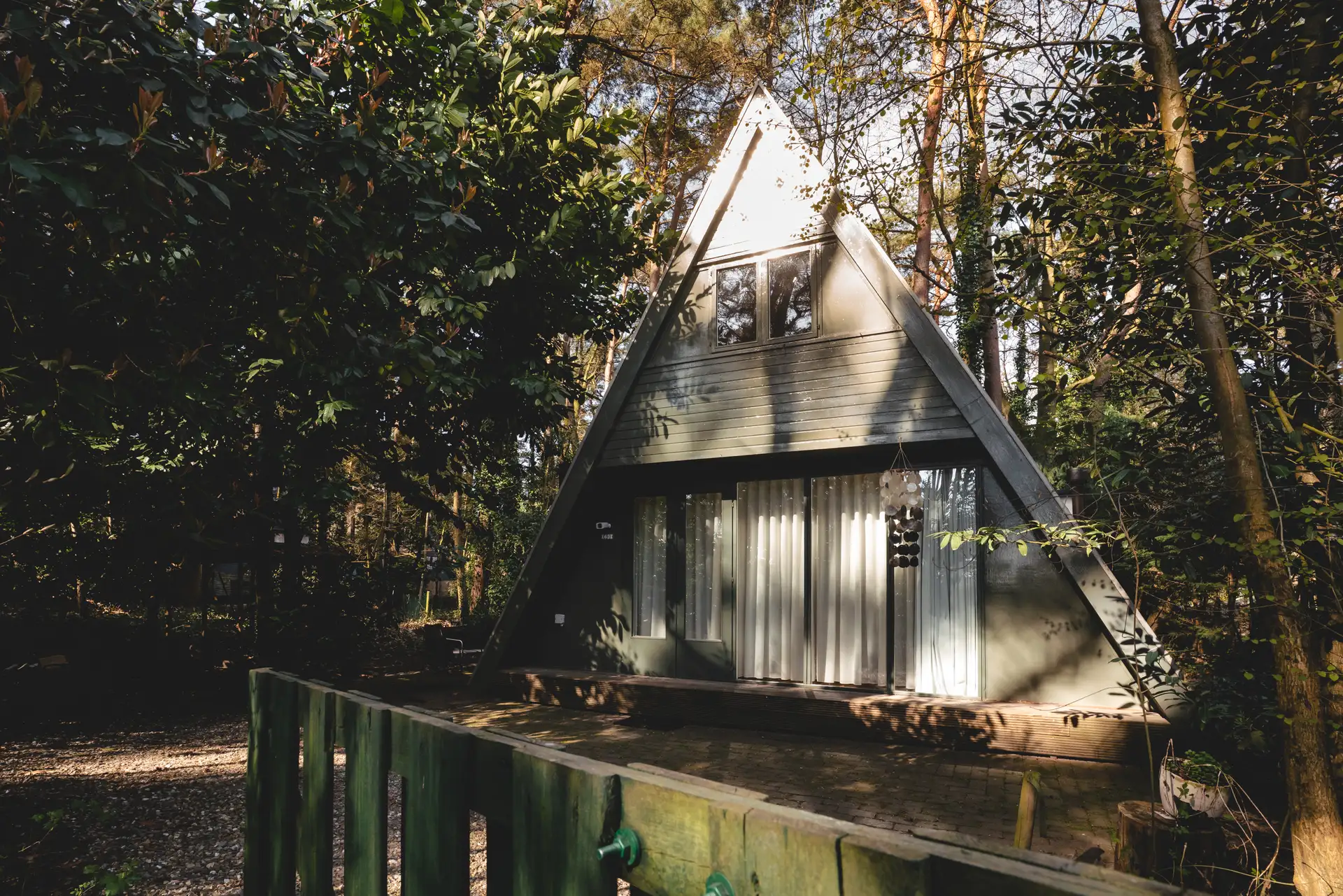 Dit **prachtige A-frame boshuisje** in Belgisch Limburg is een intiem toevluchtsoord voor stellen die op zoek zijn naar een romantisch verblijf. Genesteld in een bosrijke omgeving op een kleinschalig resort, biedt het huisje een comfortabele en sfeervolle ambiance. Het heeft één slaapkamer die je via een steile trap naar de open vide brengt, perfect voor twee personen. De woonkamer, met zijn gezellige pelletkachel, herbergt een romantisch ligbad voor ultieme ontspanning. Stel je voor, genieten van een drankje bij de kachel terwijl je de geluiden van de natuur om je heen hoort. Buiten vind je een serene tuin met terras, waar je kunt genieten van rust en vogelgezang.